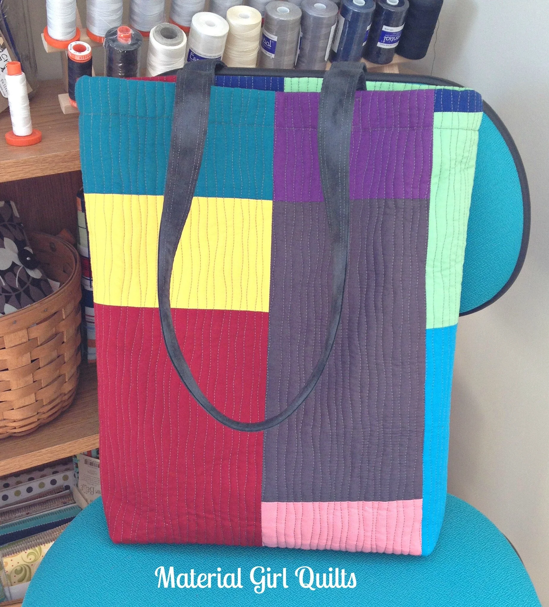 I finished this last week and almost forgot to post it on here! I've used this tote every day since I finished it. It is the perfect size for me (especially the straps). I absolutely love this bag and the awesome texture that was created with the quilting. My husband says "it's colorful!", and he's right. I guess that also means it's safe from being used by the fellas in the house :) Doesn't it look so cute and cheerful sitting in my sewing chair in front of my pretty threads?!
