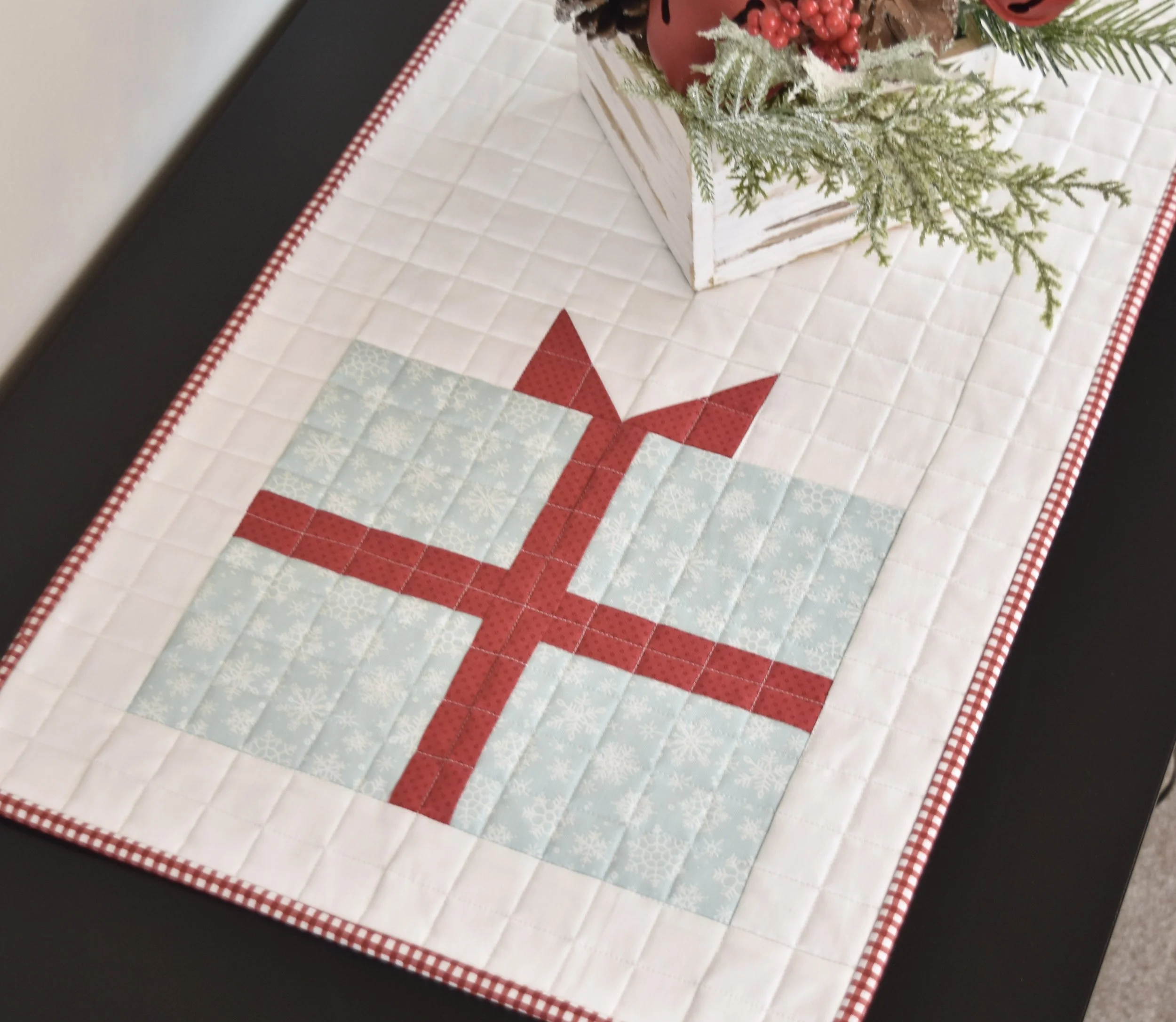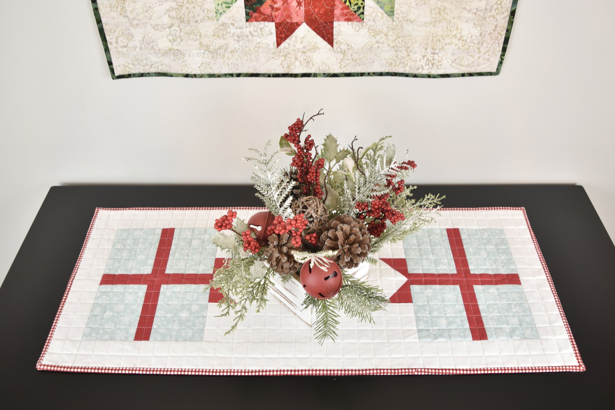 But I also adore this presents version - so cute and cheery!! The other great thing about this pattern is that it is easily adjustable in length. This particular version finishes at 14” x 34” to fit my needs, but if you’d like a longer table runner, simply change the size of the background fabric between the two block. I think this would look great as a nice long runner with the blocks hanging off the ends of a table.