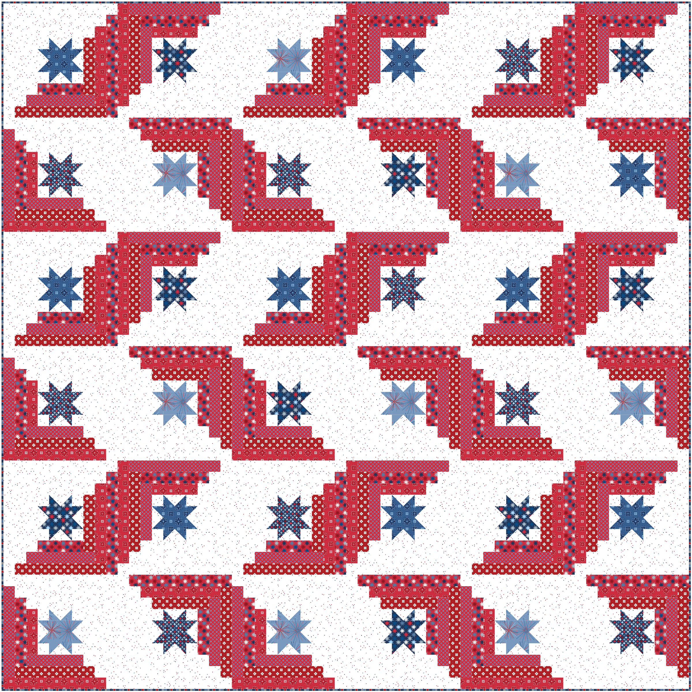 Star Spangled is a sparkling twist on the traditional log cabin block. The pattern includes two quilt sizes and seven possible layout options! Also included are what is needed for each block in case you’d like to make a smaller version of the quilt.